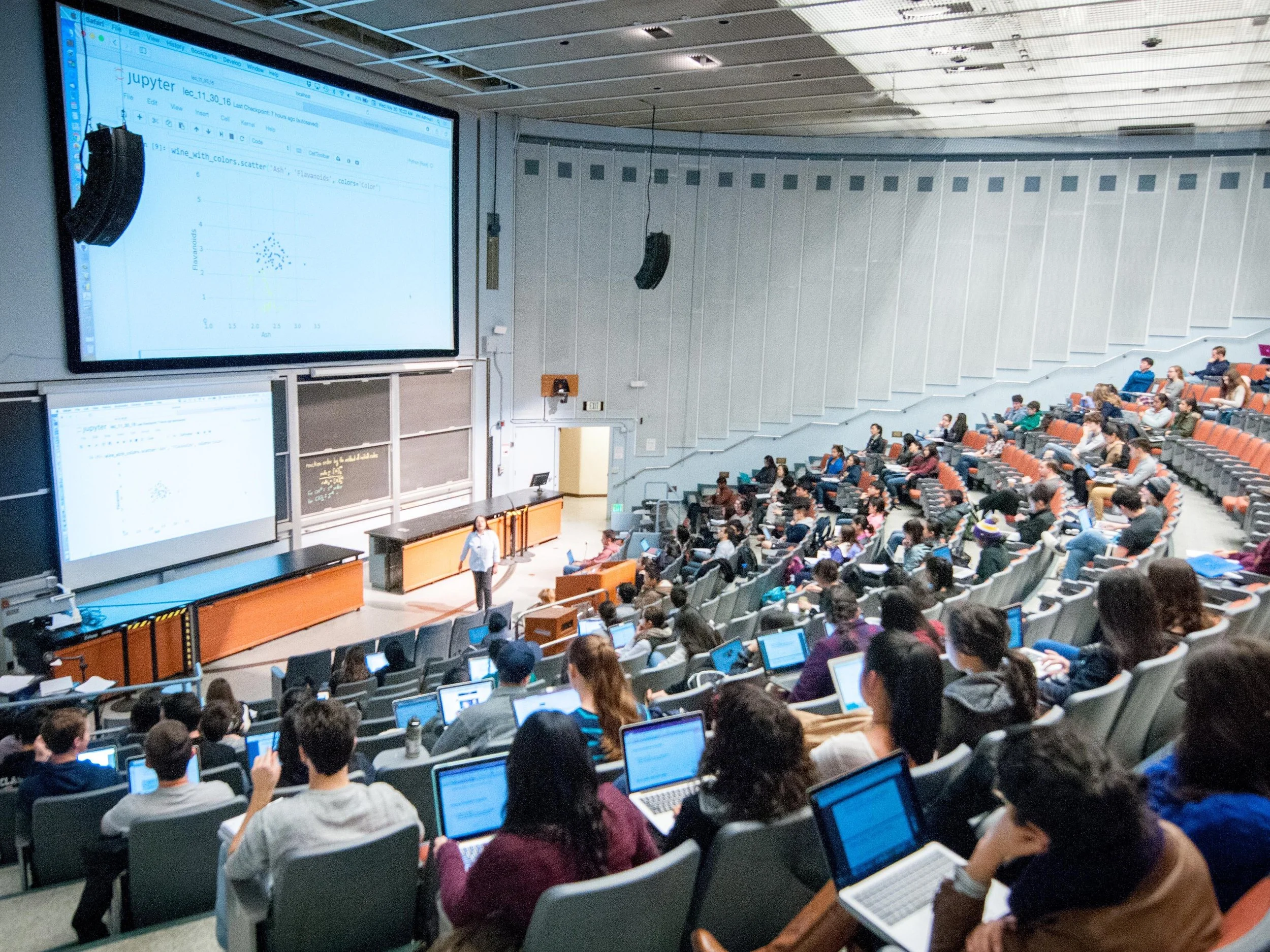 (L) Students in an auditorium during a Data 8 (Foundations of Data Science) class.