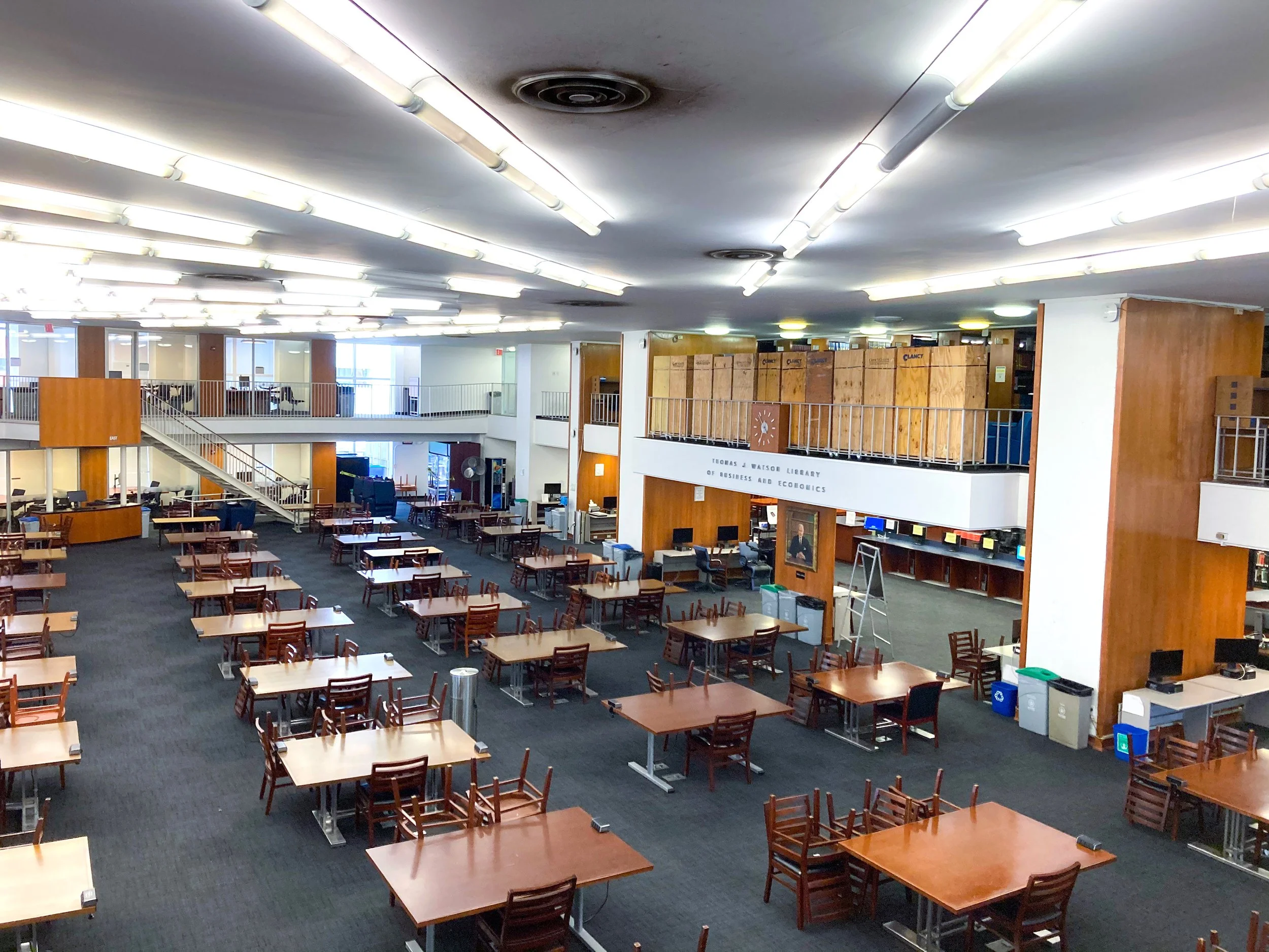 (L) Entrance to the Watson Library (R) Large study space within the Watson Library
