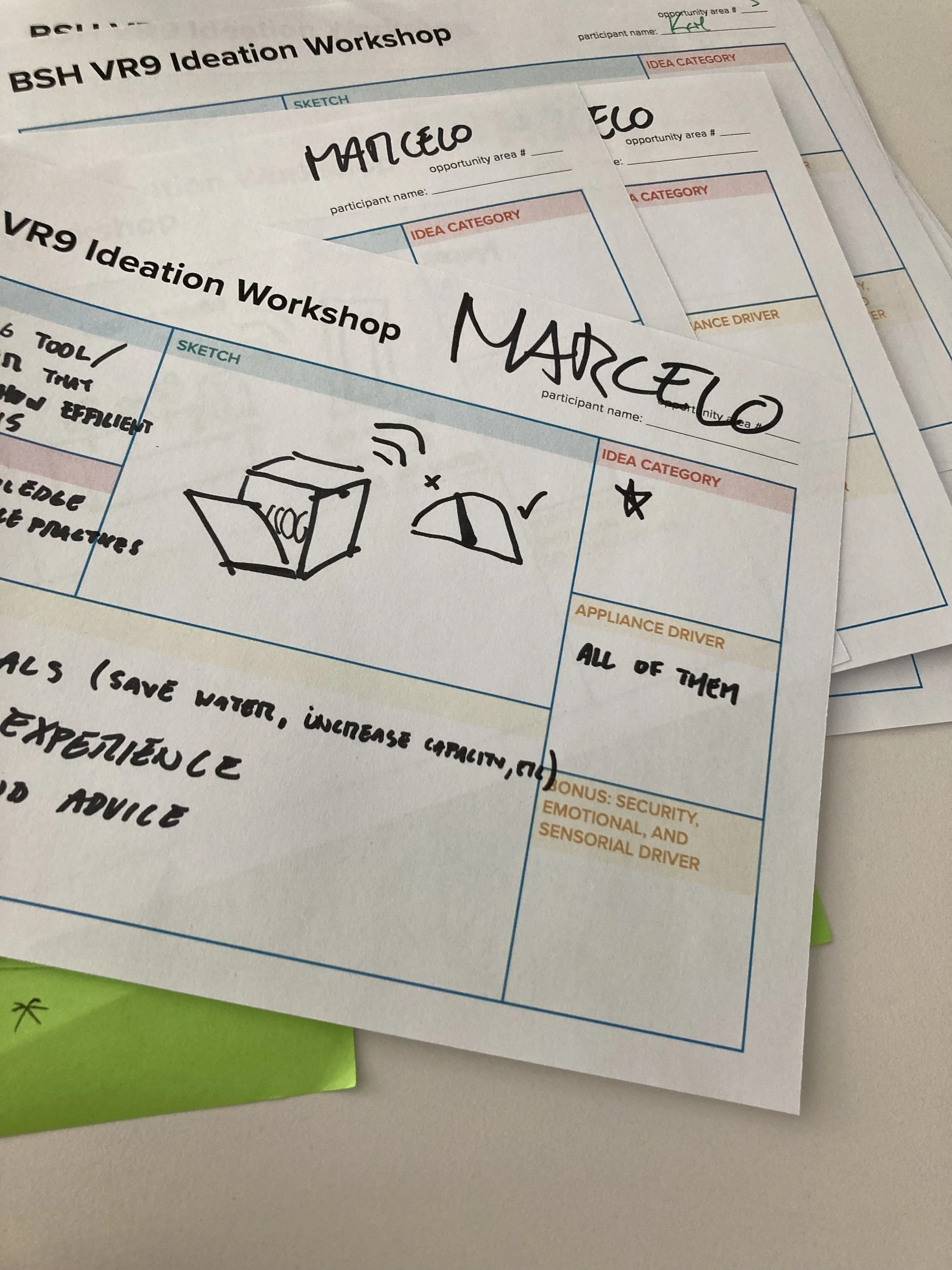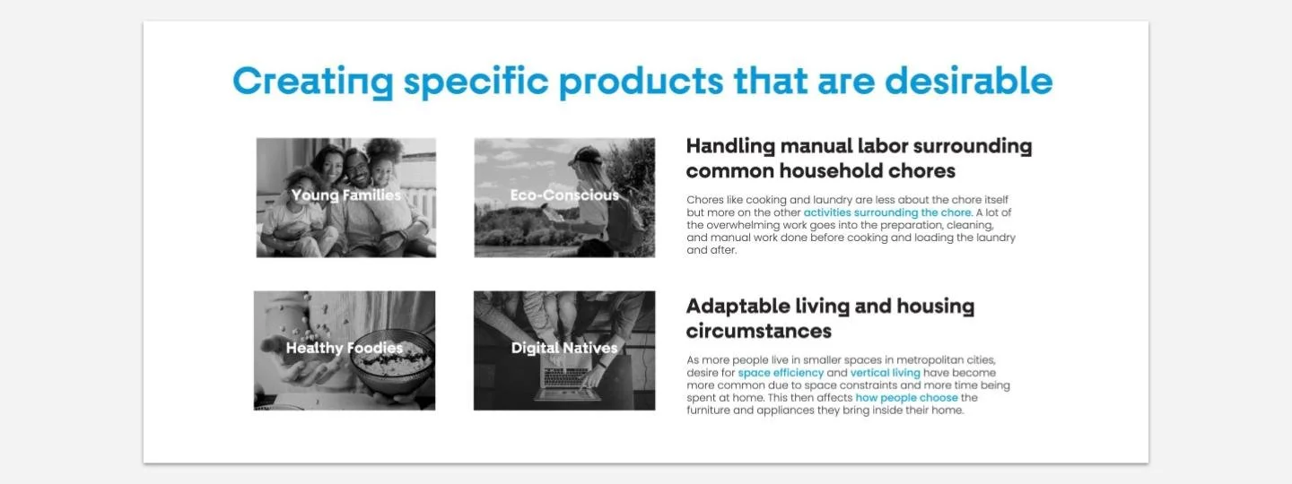 Using the trends studies and opportunity areas identified by the client in the home appliance sector as prompts, we held internal ideation sessions to gather product ideas.